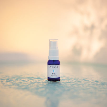 Composé d'hydrolats bi-distillés de camomille, rose, ravintsara, vanille dans un flacon en verre bleu.